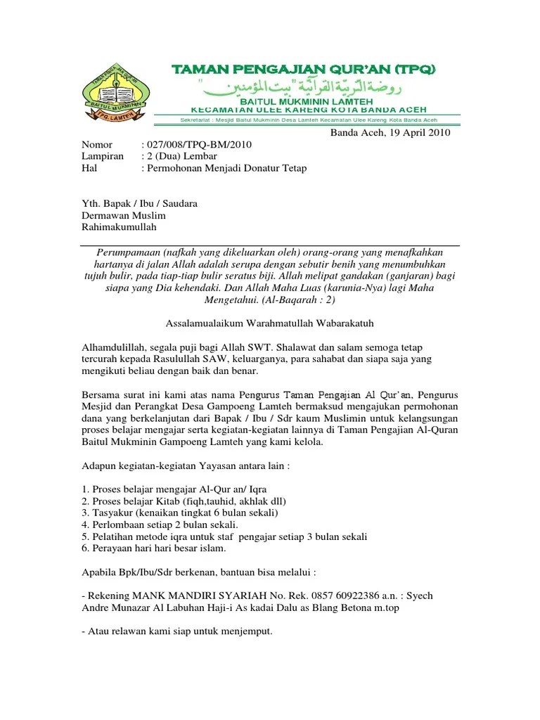 Surat Permohonan Bantuan Al-Qur\'An - Sk Bop Lpq Direktorat Pendidikan Pondok Pesantren. Dengan menyebut nama allah yang maha pemurah lagi maha penyayang. Contoh surat mohon sumbangan al quran contoh surat.surat permohonan bantuan biaya pendidikan kepada yth, pimpinan pt.pln (persero) wilayah sumatera utara dengan hormat, saya yang bertanda tangan dibawah ini: Semoga berkenan, sehingga allah s.w.t mencatat setiap amal perbuatan. Guna memohon izin, meminta suatu bantuan, adanya. Contoh surat mohon sumbangan al quran contoh surat.surat permohonan bantuan biaya pendidikan kepada yth, pimpinan pt.pln (persero) wilayah sumatera utara dengan hormat, saya yang bertanda tangan dibawah ini: